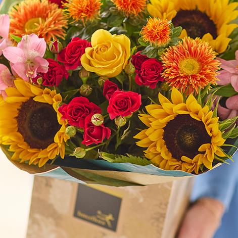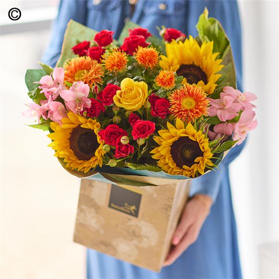 A classic handcrafted bouquet made by a local florist using the freshest blooms and not a single lily. Expect blooms in rich vibrant colours like cerise, fiery orange and sunshine yellow, expertly arranged and shown off in our iconic packaging.